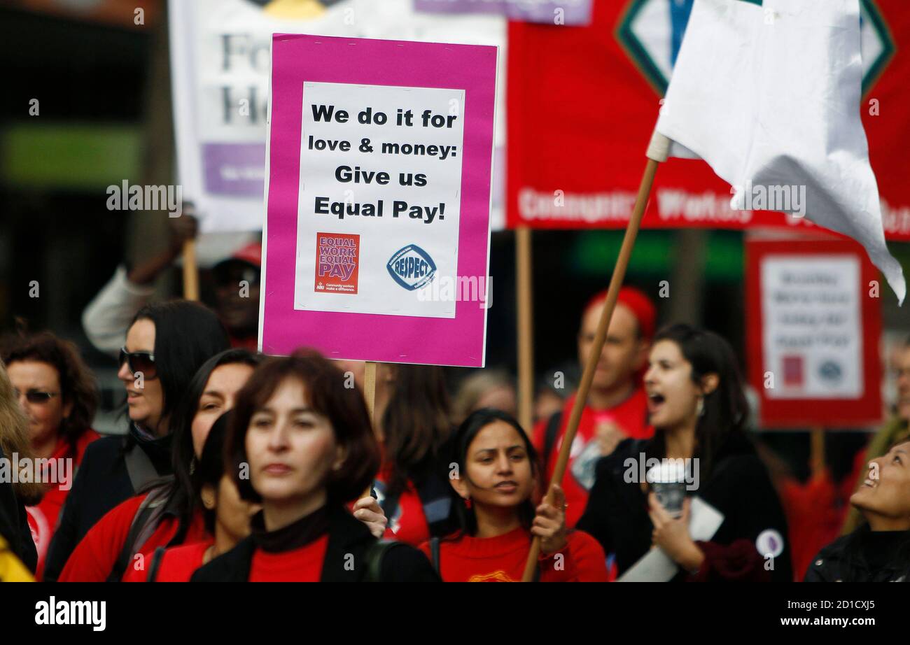Women Workers Hold Up A Sign Demanding Equal Pay During A Protest In Melbourne June 10 2010 Australian Employment Jumped A Strong 26 900 In May To Extend A Remarkable Run Of Jobs